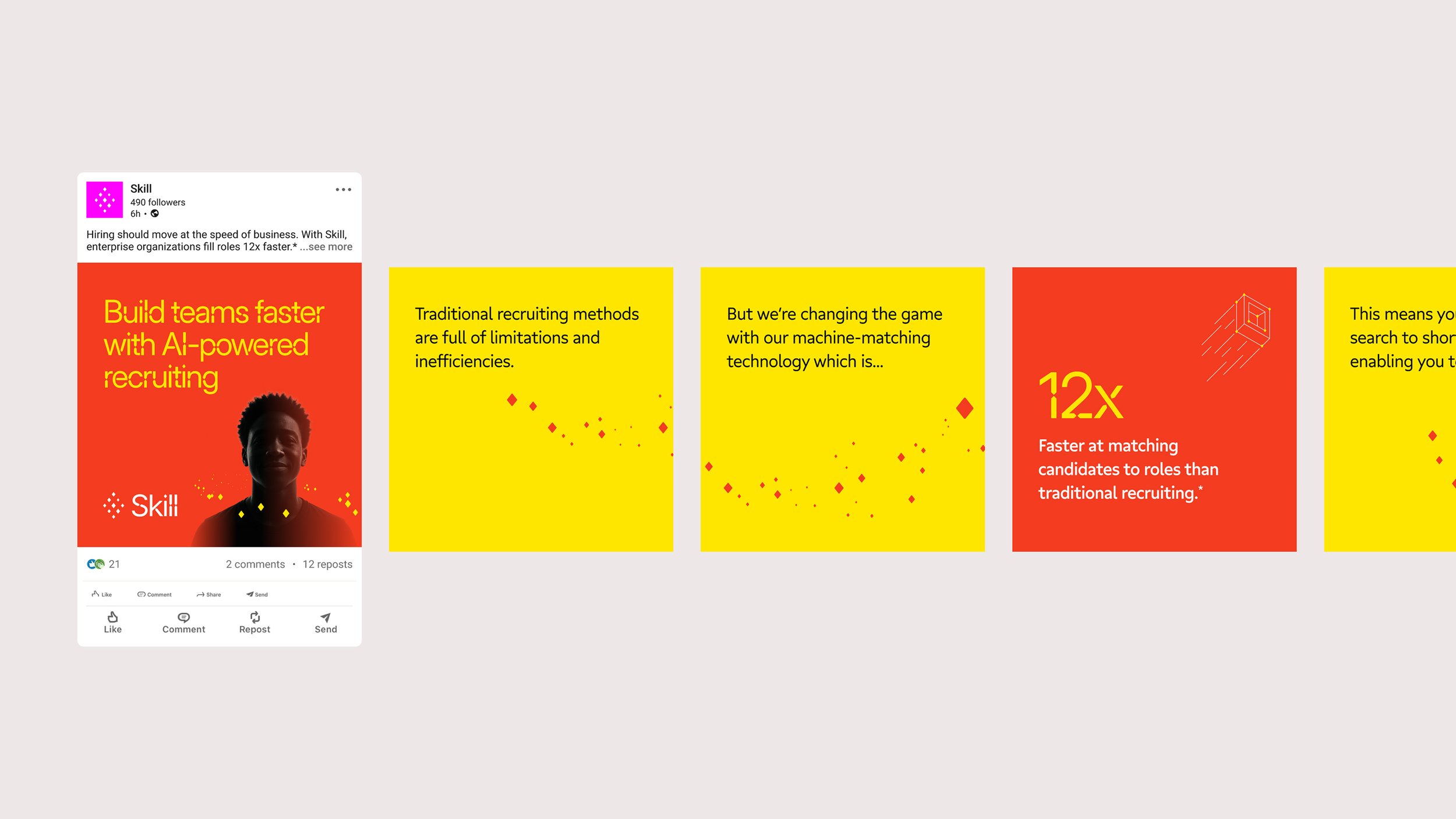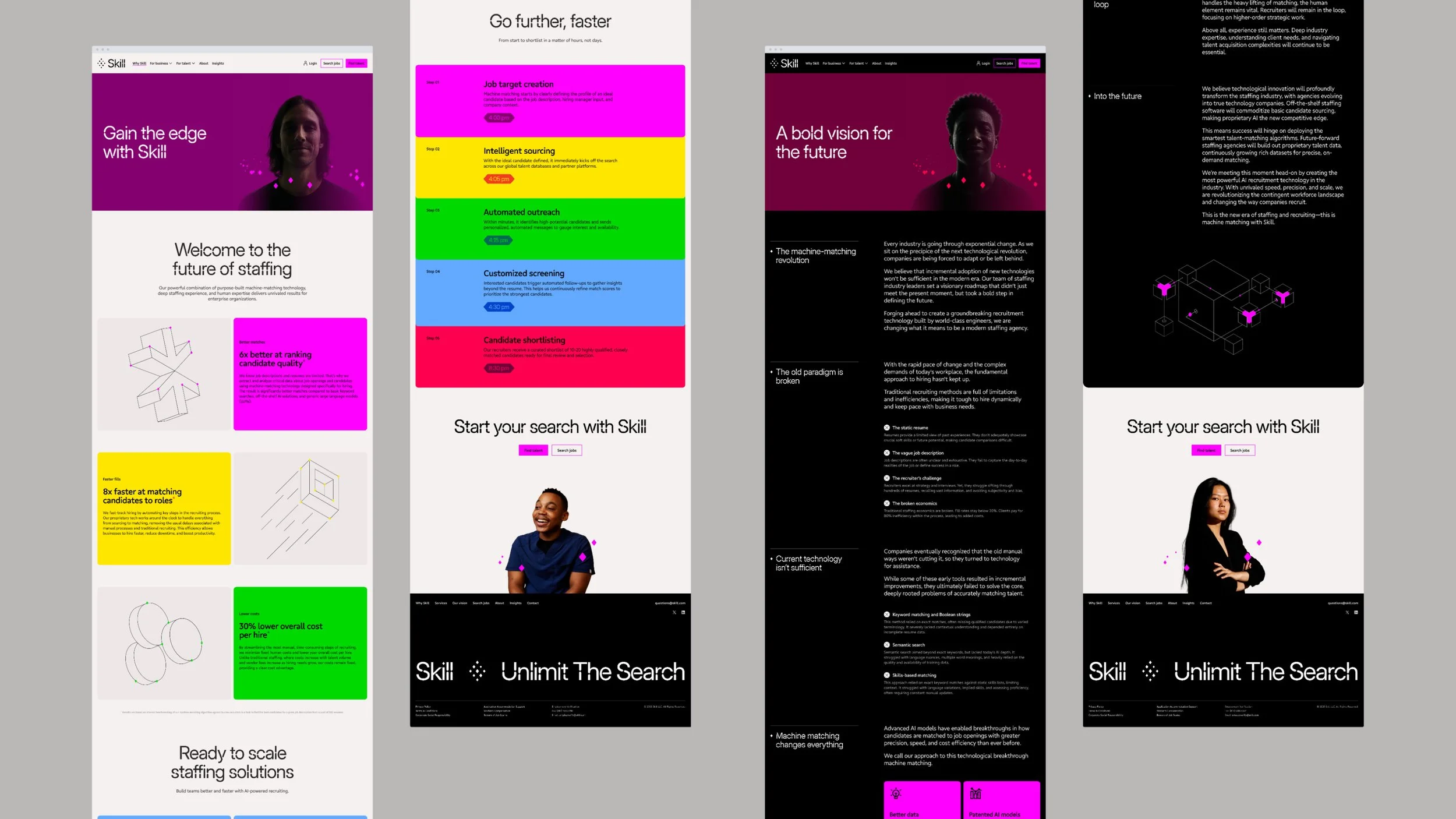 Following the foundational identity phase, I transitioned the brand in-house to lead its evolution and market activation. I guided my cross-disciplinary team—spanning creative, design, and experience—to transform these core elements into a scalable digital ecosystem that could be applied across channels. To drive a cohesion across the customer experience, I collaborated closely with the product team to ensure the brand identity was woven into the user journey. We built a high-impact experience at Skill.com, utilizing custom motion assets and a premium editorial platform to showcase intellectual leadership. Beyond the digital footprint, we developed a comprehensive sales enablement system and immersive event experiences, ensuring the Unlimit the Search narrative resonated with a singular, sophisticated voice as we brought this new business to market.