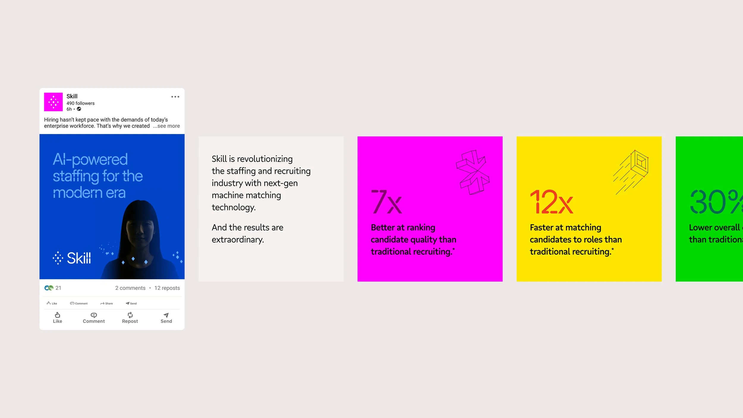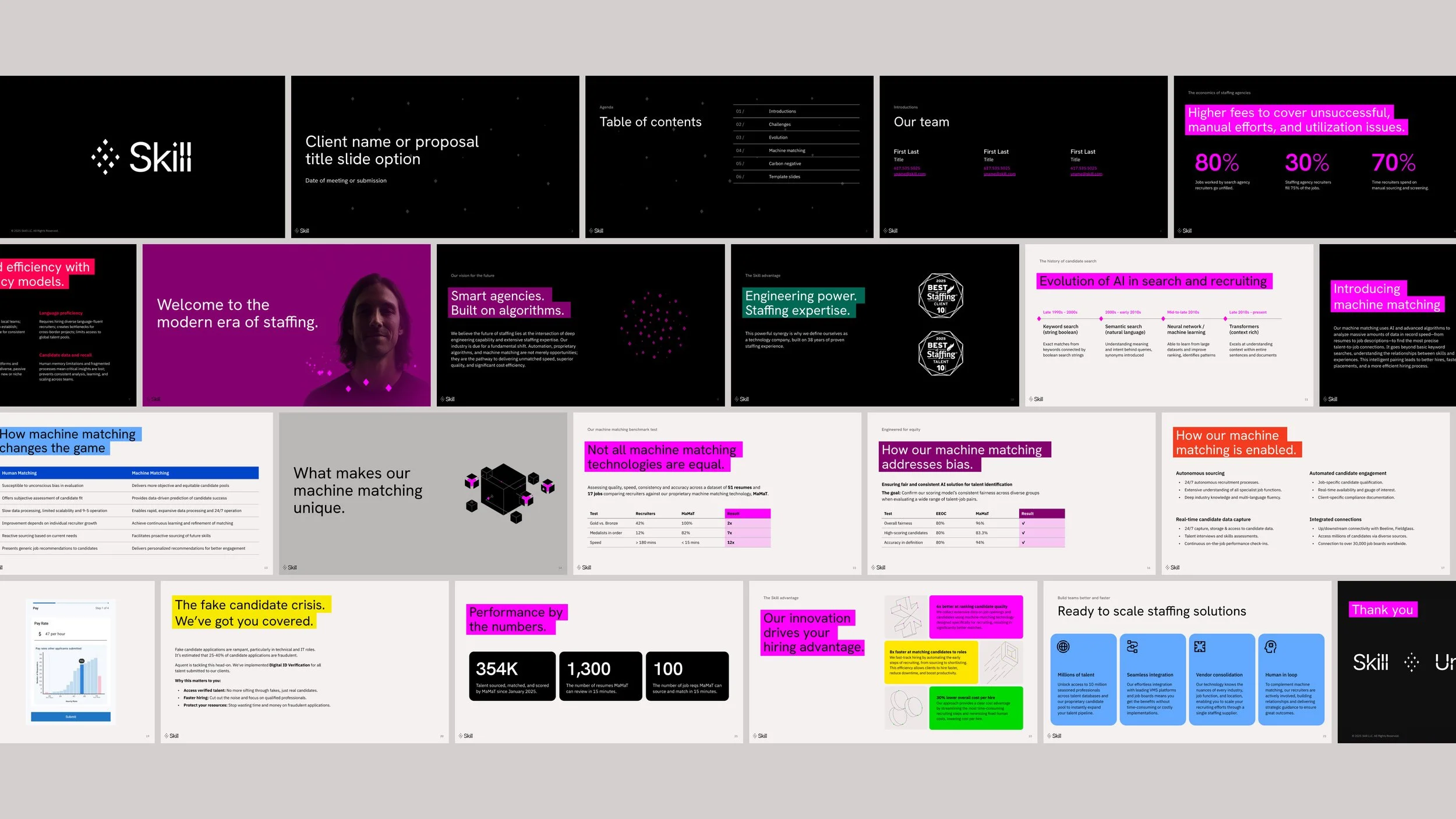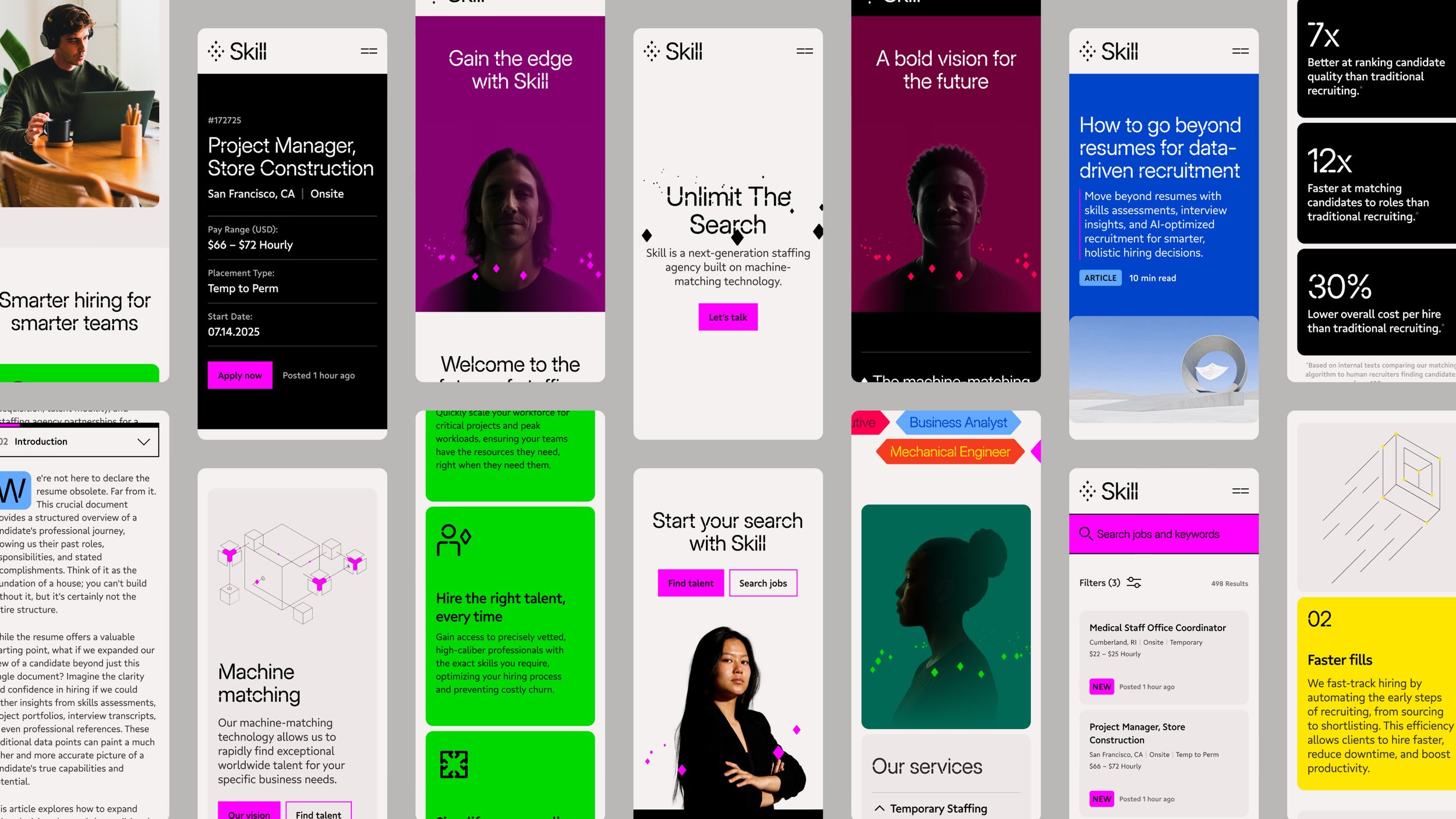 Skill is a next-generation recruiting company powered by proprietary, patented AI technology, launched by Aquent CEO John Chuang. Drawing on 40 years of global staffing leadership, Skill was built to disrupt a long-standing industry and define the future of recruiting. My role was to capture this vision and define a dynamic, high-performance brand that represents a total departure from traditional staffing models. To establish this new brand identity, I orchestrated a high-level collaboration with Pentagram NYC to define the brand’s strategic north star: the edge. This concept encapsulates the definitive advantage of Skill’s AI machine-matching engine—shifting the paradigm to a technology-first model centered on advanced intelligence, precision, and speed.